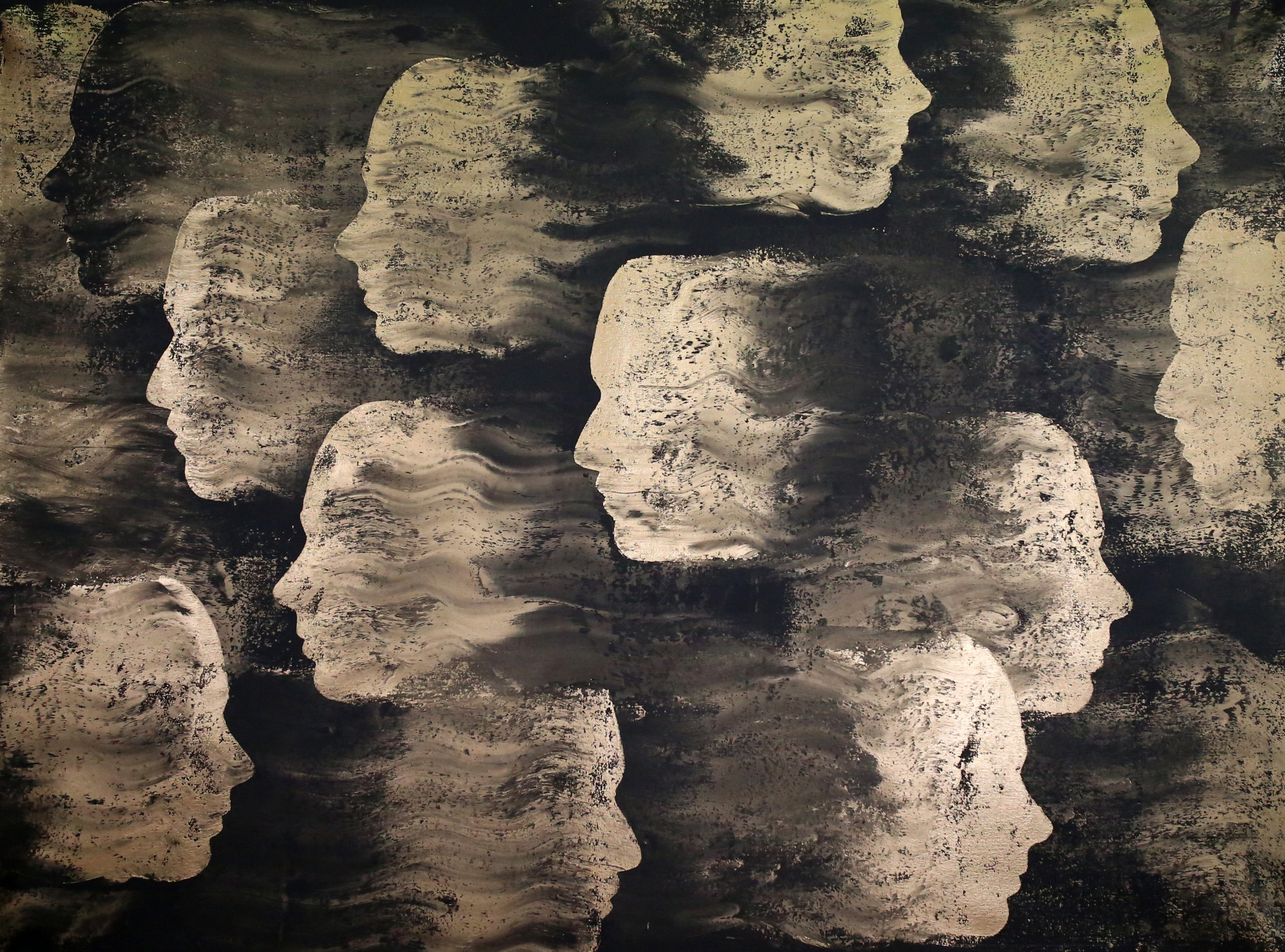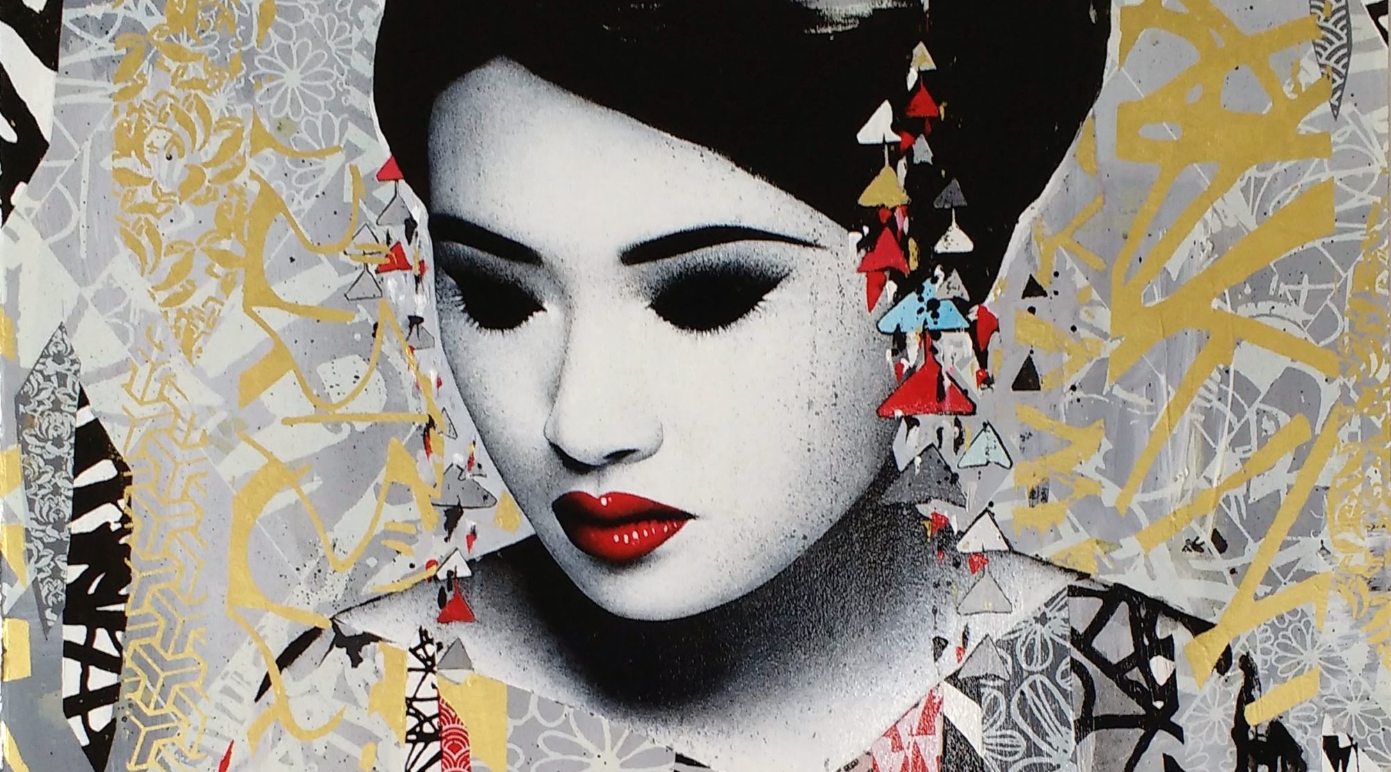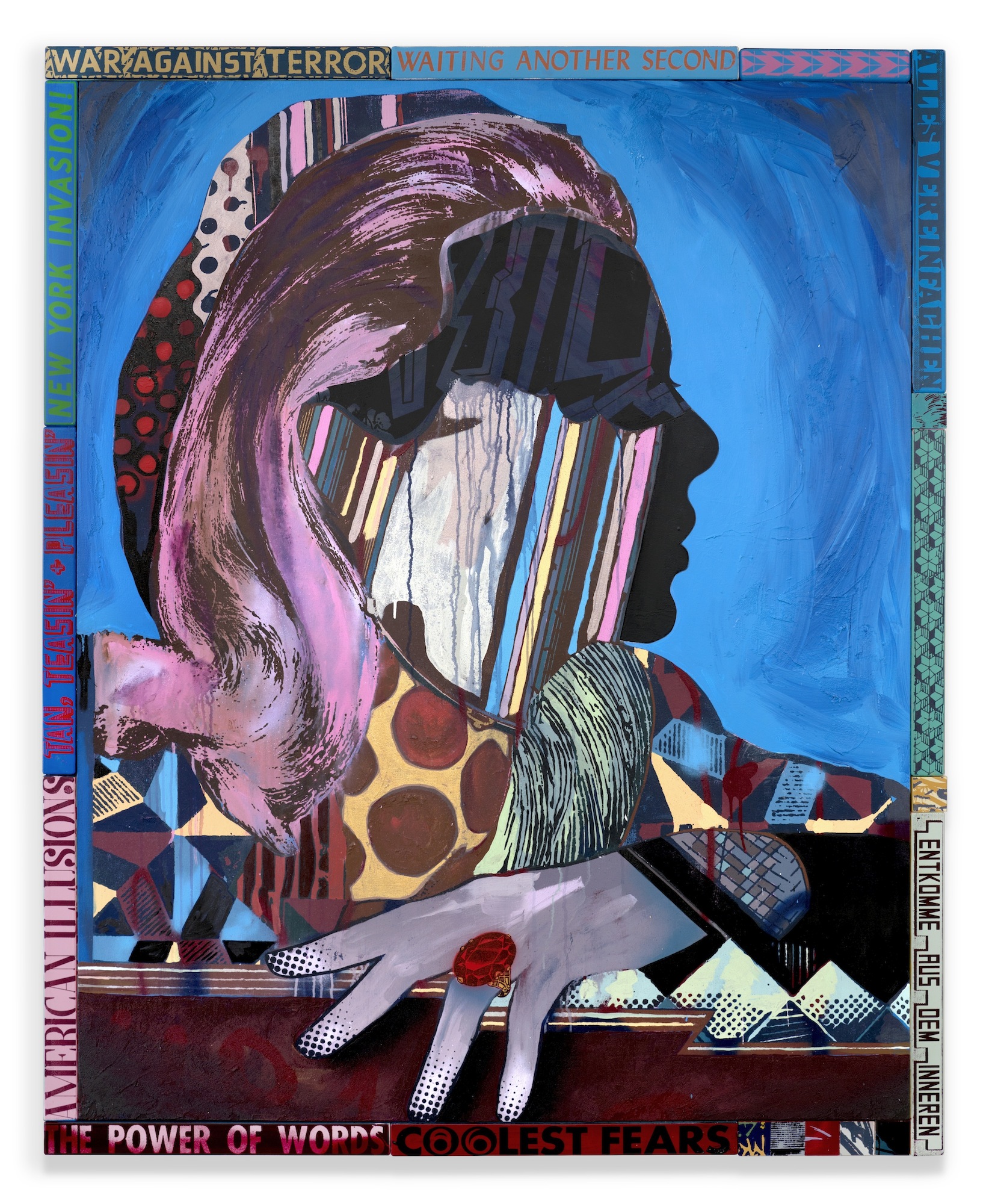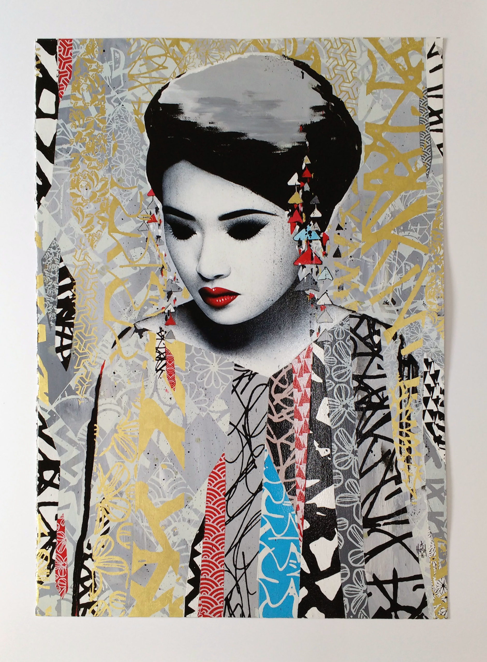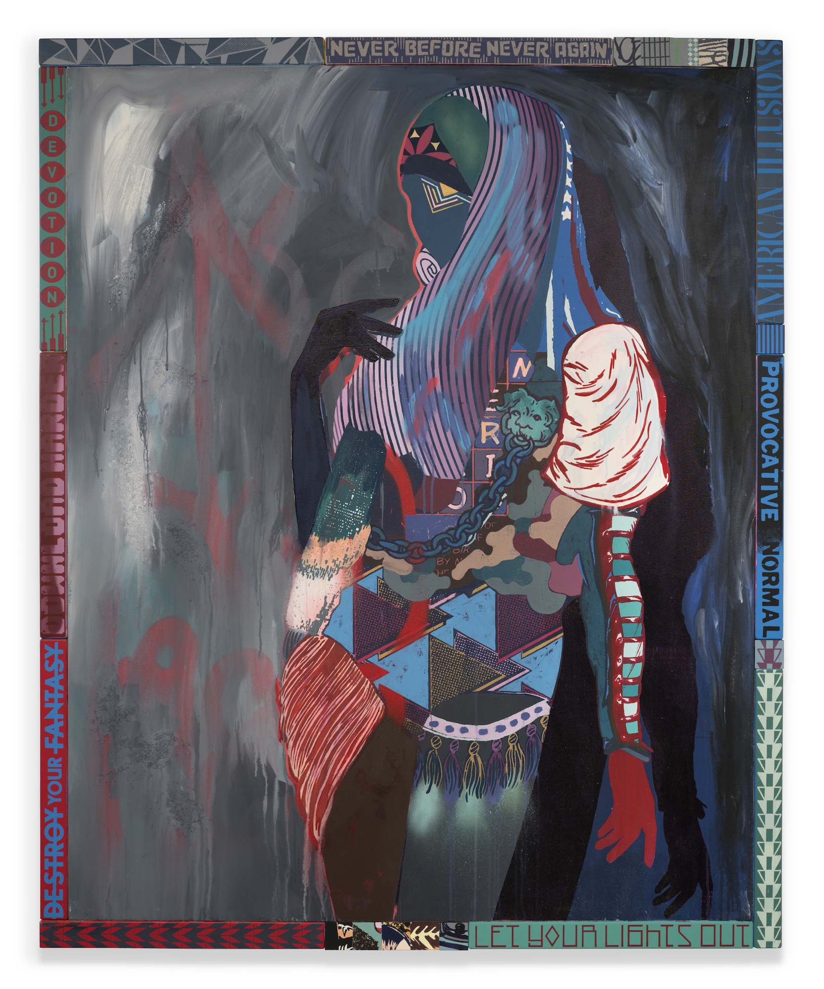 FAILE, Ziya, Acrylic, Silkscreen Ink and Spraypaint on Canvas, Woodblock Frame, 132 x 163 x 4,5 cm / 52 x 64 x 1,75 inches, 2017