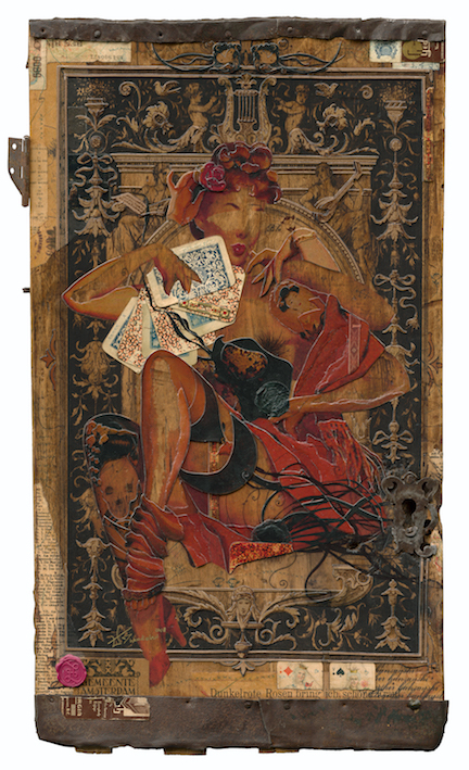 Handiedan, Jane Stone, Mixed media. UV Print, acrylic paint, pen, digital collage and hand cut collage. Paper layers and found material, matte varnish on found wood with rusty metal, 15.5″ x 27.5″ / 39.5 x 70 cm, 2018