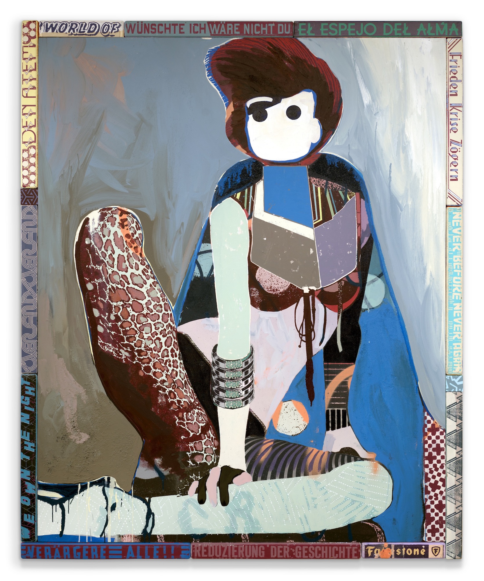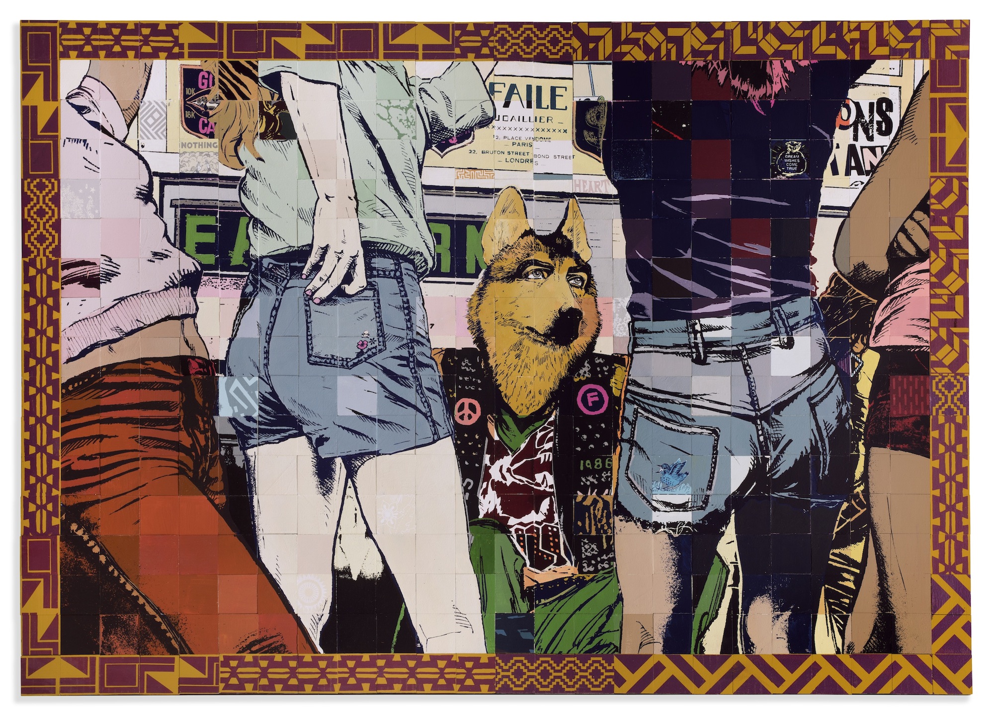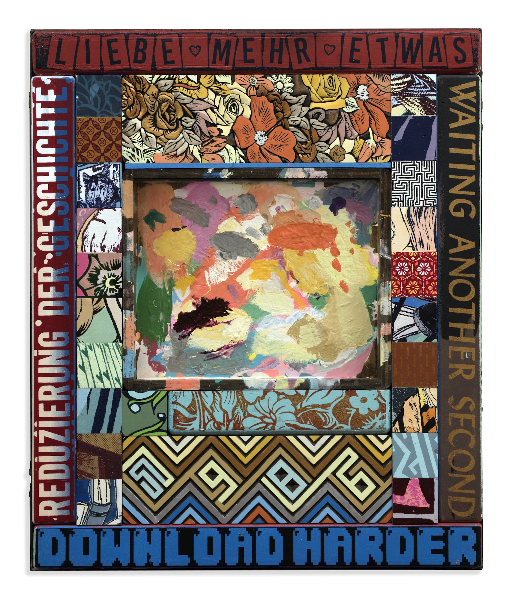 FAILE, Andie, Acrylic, Silkscreen Ink and Spraypaint on Canvas, Woodblock Frame, 132 x 163 x 4,5 cm / 52 x 64 x 1,75 inches, 2017