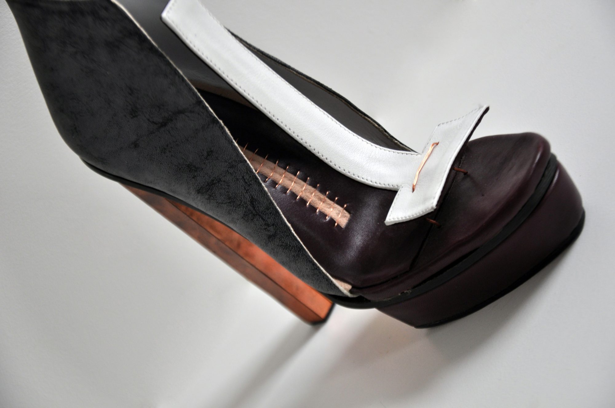 Carolin Holzhuber, Conjoined Illusion Sole A, Kalbsleder, Lammleder, Silberdraht, Kork, Carbon, 2014, © Thuy Pham